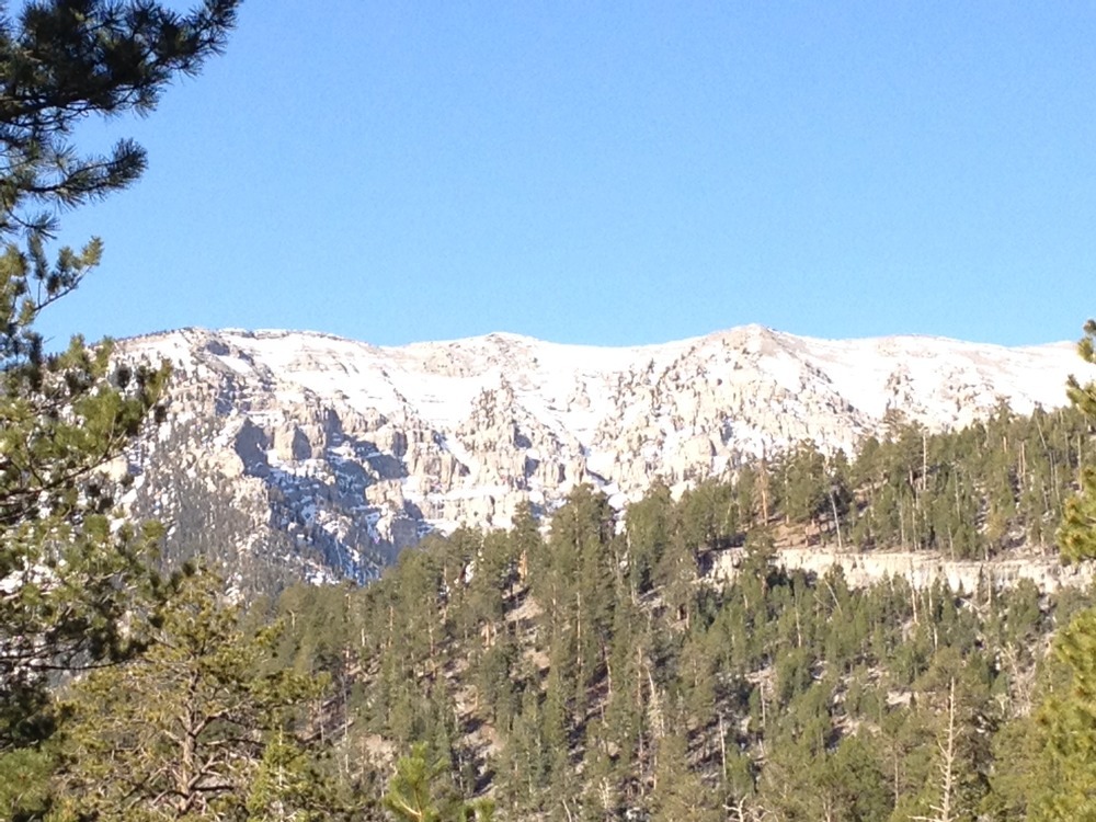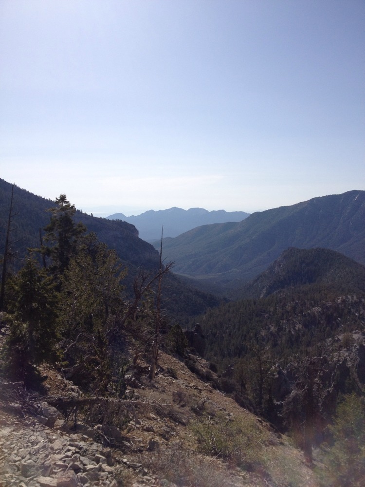 I hit the trail at 7:30 in the 42 degree air. It was spectacular. The pine smell was intoxicating and the views of the surrounding mountains were amazing. The trail terminates at about 9,300 ft on the saddle which leads to Mt Charleston, another six miles along the ridge. I hiked a portion of the narrow ridge away from Charleston and the views were great. I can’t wait to go back and do the whole 12 mile loop. But I need to do a little more at those elevations first.