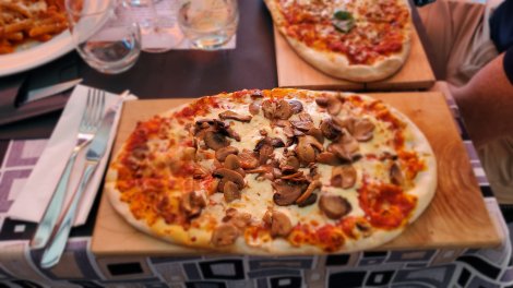 We bought direct tickets back on an “express boat” scheduled to leave at 6:20pm. It was currently 4:45pm, and we were starving. Tim found a restaurant in the Hotel Metropole Bellagio with room for us for a meal, while sitting on a balcony overlooking the lake. We sat at 5 and I started panicking. I didn’t see, after how everything had gone today, that we were going to make the 6:20 ferry, which was the last one capable of getting us back for our train, if we had an even remotely normal Italian meal. Service is long and slow by design, and I didn’t want to be stuck buying two more sets of tickets bevause we were late. I was thinking getting a snack might be best at the restaurant and then getting take out for the ride made the most sense. The servers assured us we’d be okay, and I was ridiculed by my traveling partners for being, overly nervous. So I decided to trust them. They still made fun of me and we were done with a great meal and bottle of wine before 6. I was wrong, they were right. By the way, the pizza was out of this world…Once we got to the pier for the ferry at about 6:10 there was a huge line. I was hoping to get an open air seat so Michelle and Chloe could potentially dodge some motion sickness, so I was a little concerned by how many people were ahead of us. But then we kept waiting. And waiting.Finally, at 6:40, the boat arrived. Our first boat took 2 hours to make the Como to Bellagio run. We had a train to catch at 8:10 and we were all starting to get nervous. We had even been talking about hotels in Belaggio and early morning boats and trains as contingencies. We were all skeptical about actually making it. And then it got worse.