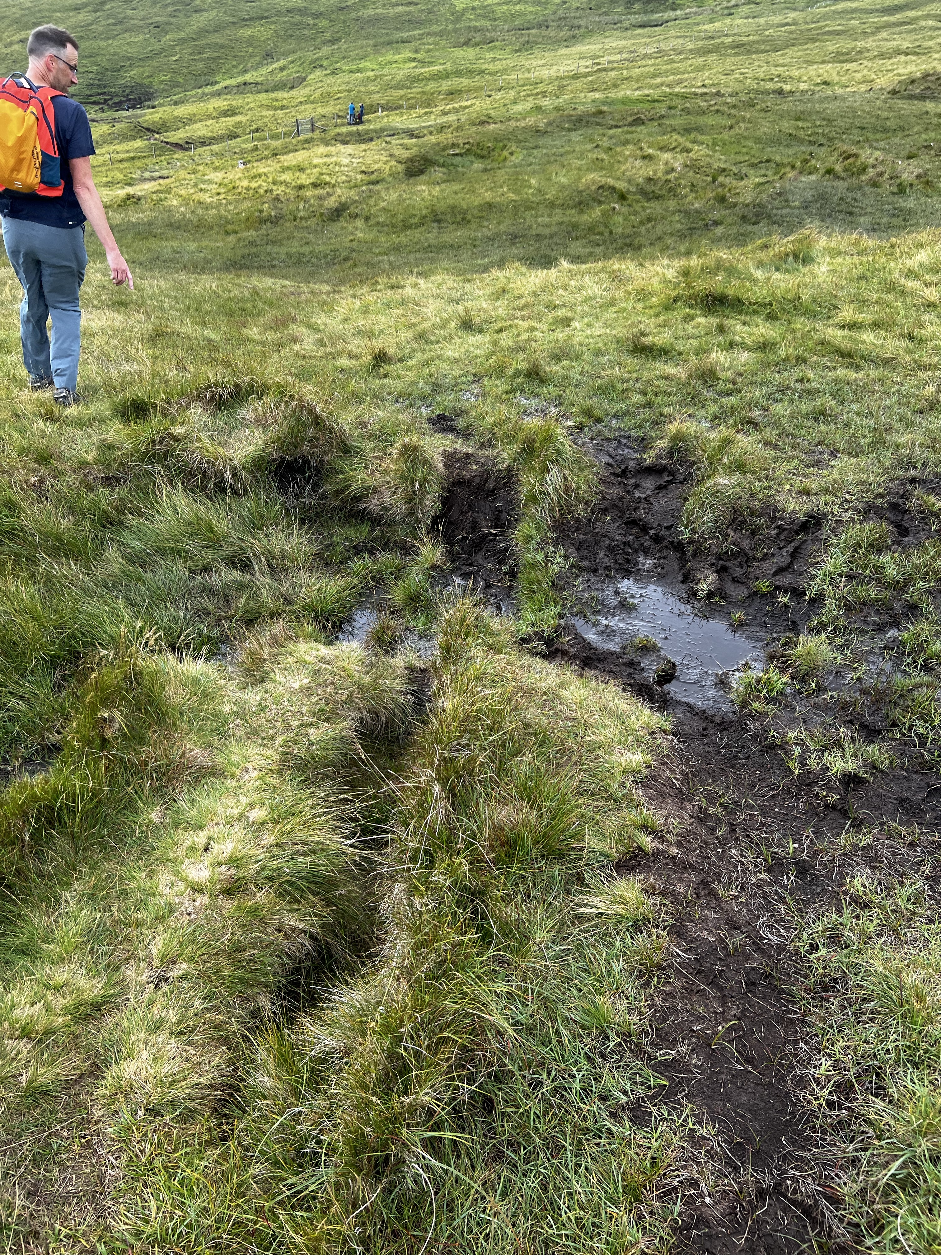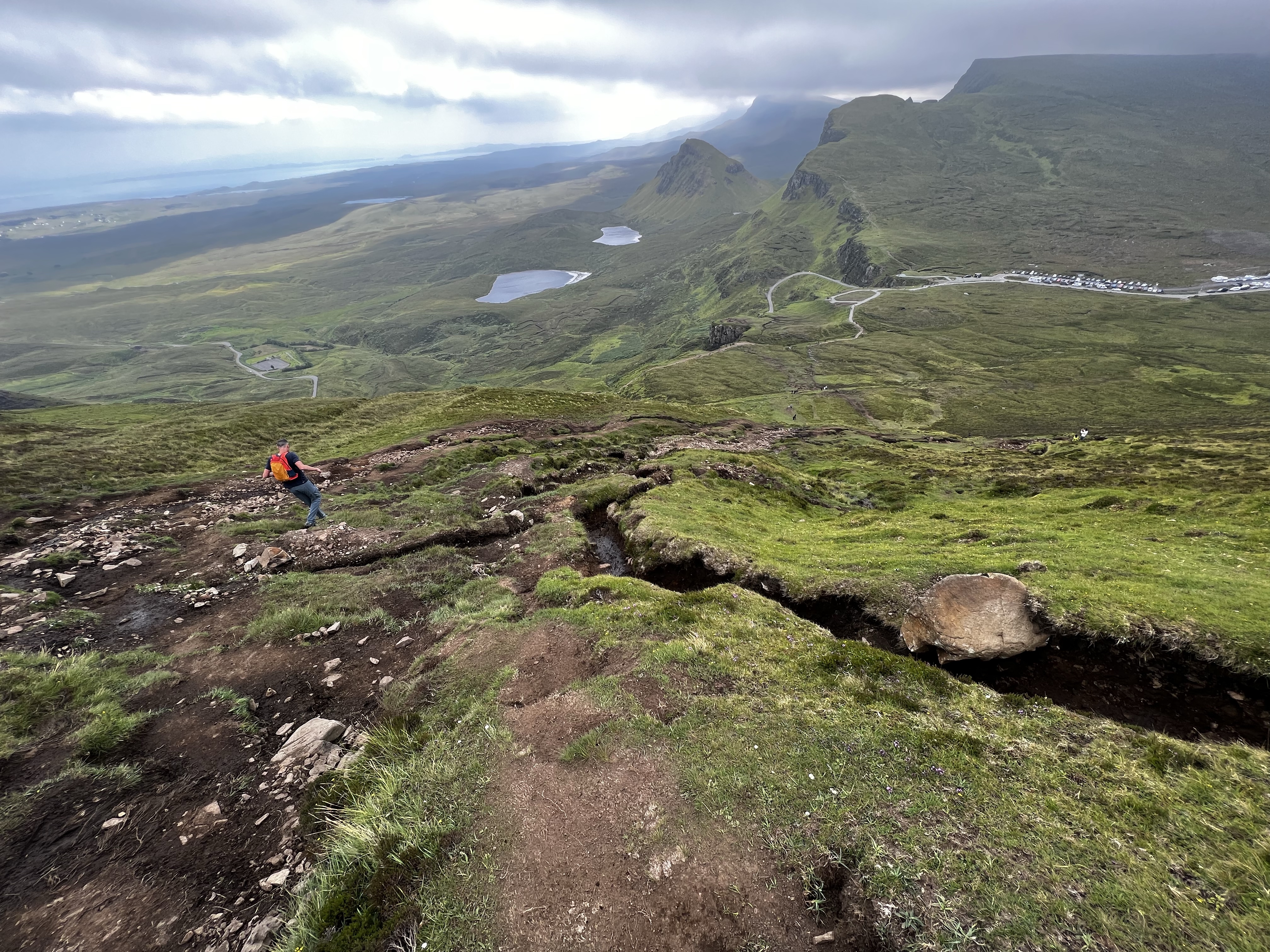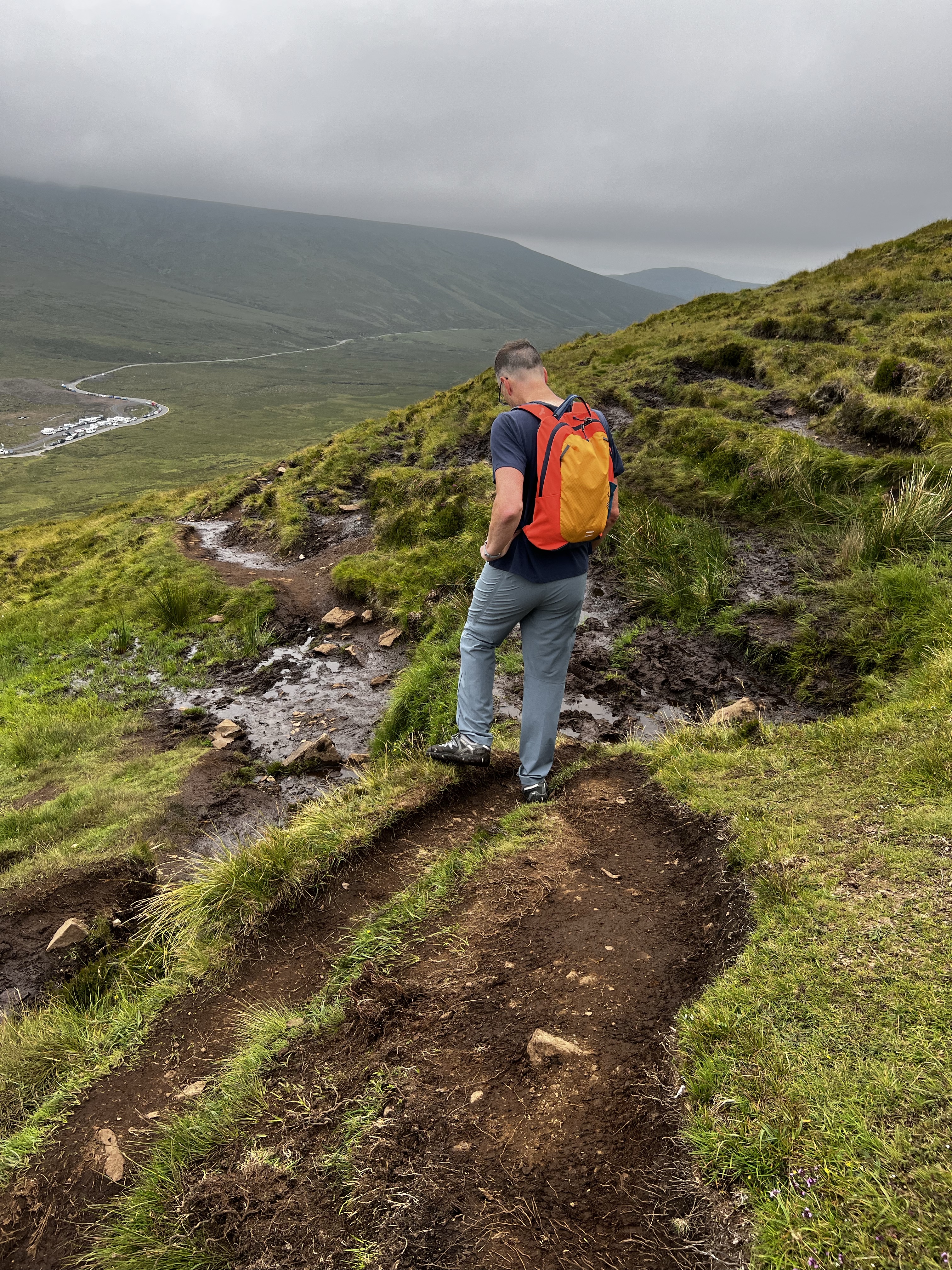 The walk up and over the ridge line was far more challenging than either of us expected. Plus, it was “boggy.” That’s the term they use here around the land when it is peat filled and wet. It was impressively wet. And slippery and slimy. We spent a lot of time talking before the trip about footwear and fortunately we brought waterproof boots and happened to be wearing them. Most of our descent was a steep rutted muddy mess. It was slippery and required really cautious footwork. There were a number of times that we had to walk back up the slope to escape the wet just so we could find a safer dry path down. We both took great joy in watching the ill prepared try to walk up this way rather than the normal path that is actually scenic. Not a good idea.