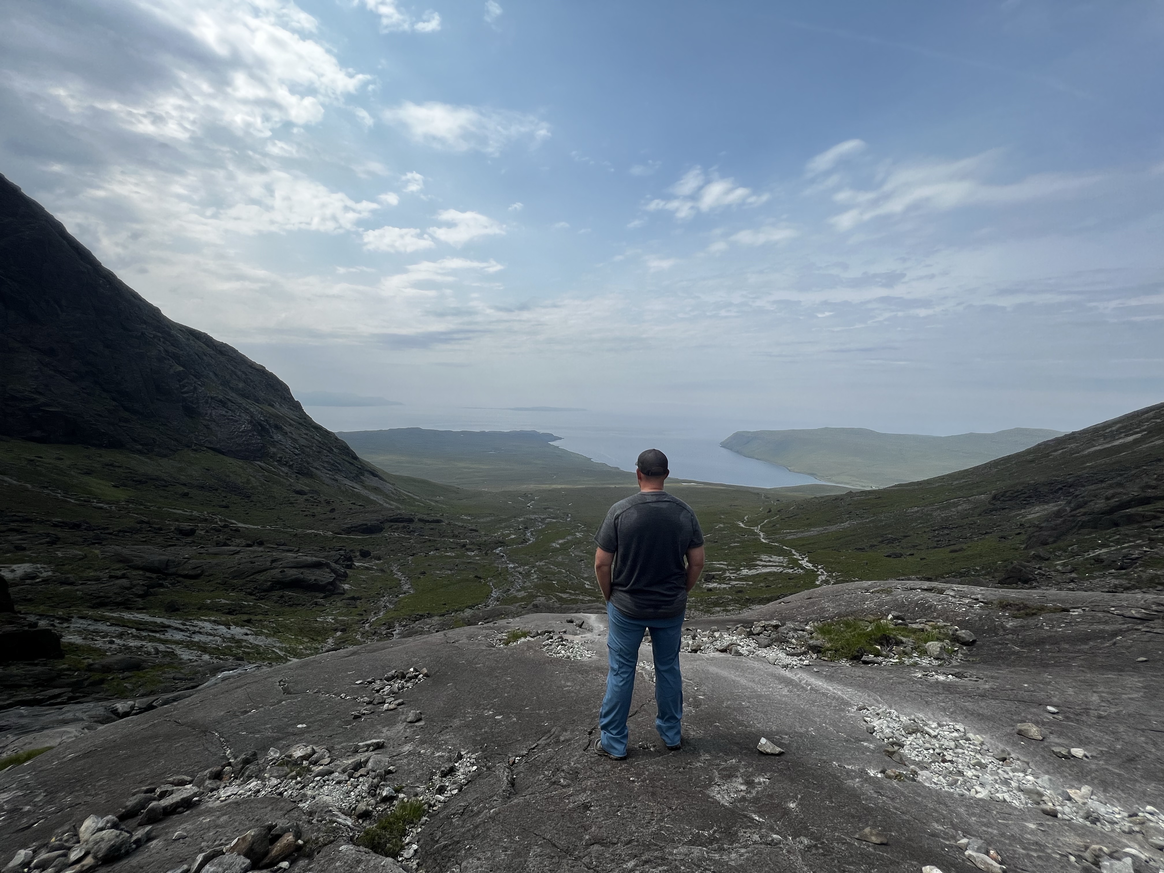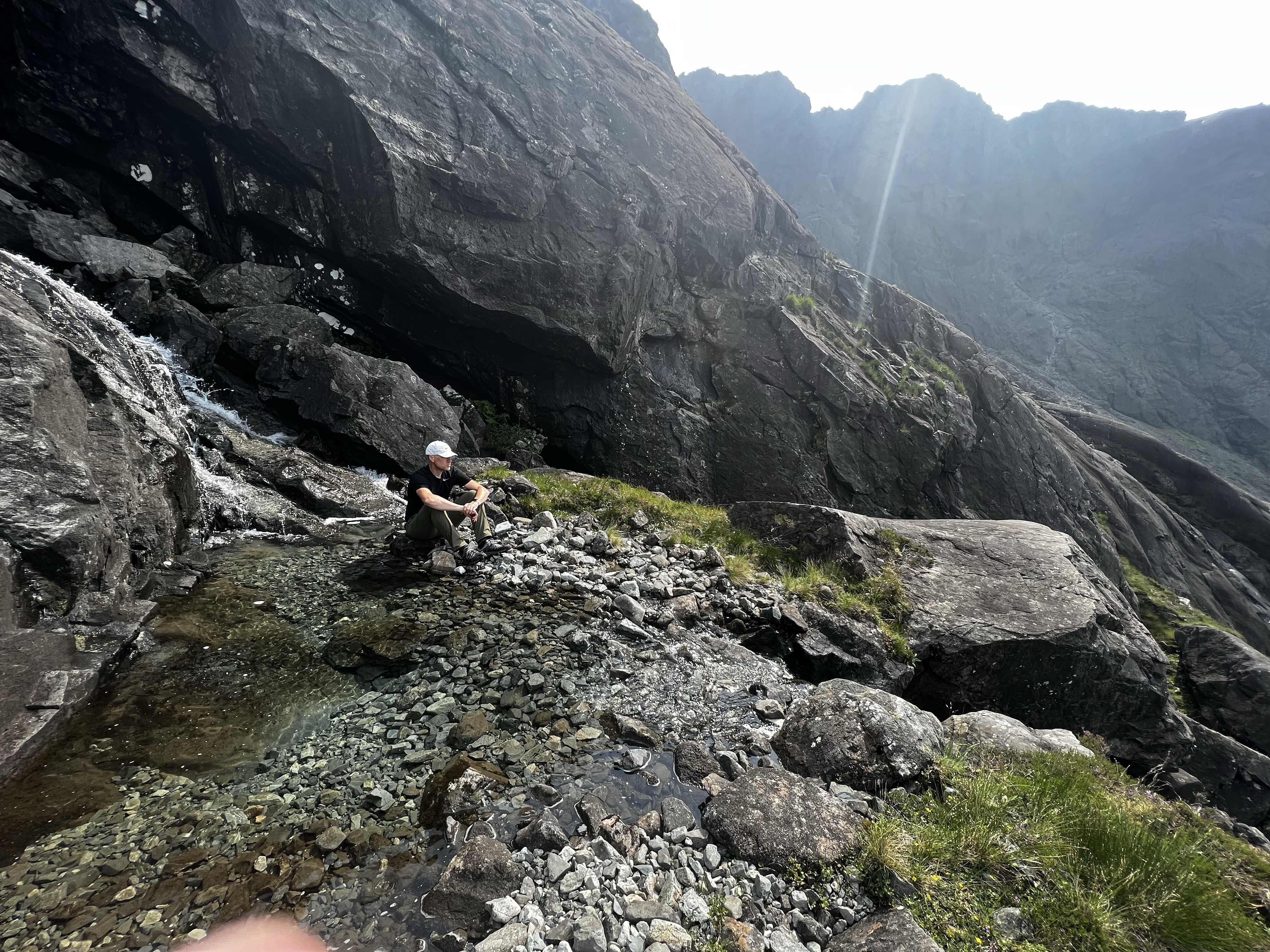 We made it up and scrambled up a scree slope to a large rounded rock at the waterfall where we had a snack, goofed around taking pictures, and laid down to enjoy the sun. The alpine air coming down out of the Cuillins – the highest mountains in Scotland – was refreshing and kept the bugs at bay.