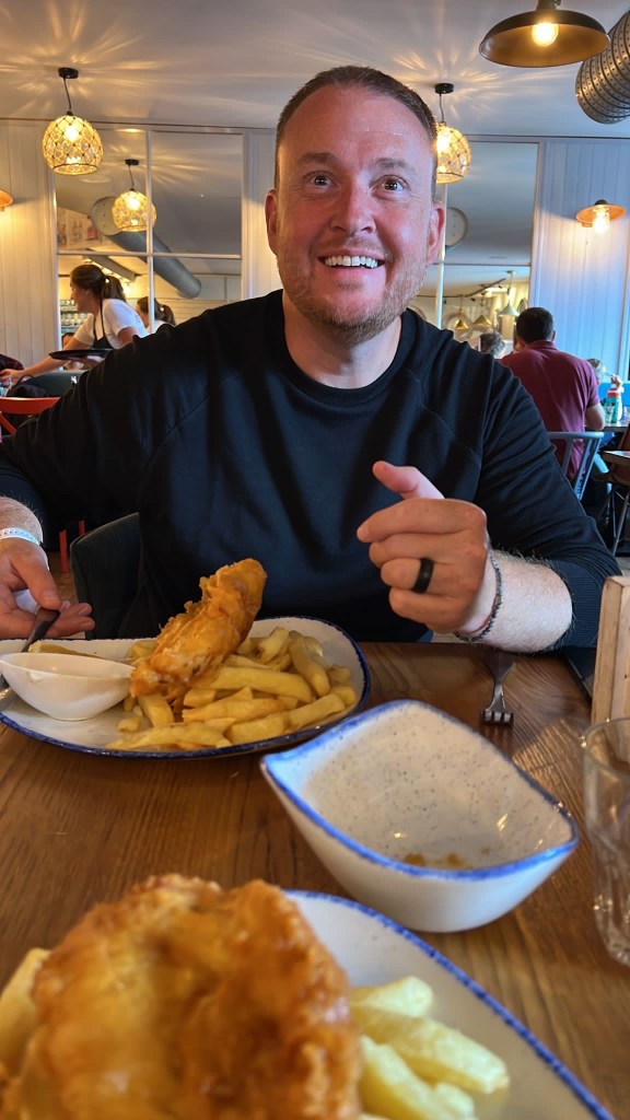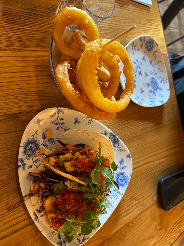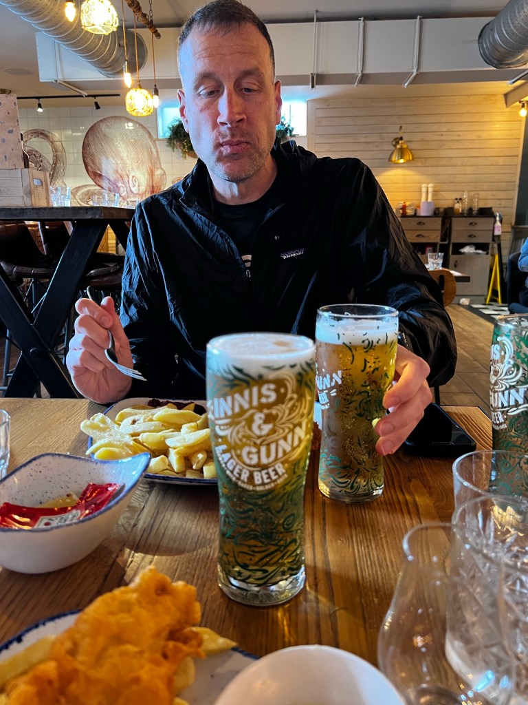From there we traveled a very short distance to try a place which stated it had the best fish and chips. As we had become connoisseurs, we had to try. We started with some halloumi tacos – Stretch’s new favorite – before diving in to the meal. I also had to sample some whisky as I had dodged that so far on the trip. The photo below shows my sheer joy in the meal, potentially influenced by the whiskey. It also shows what happened to stretch when he mentioned a second beer to two different servers, he got a third…. The fish and chips were good, but nothing compared to the Seafood Marketplace in Kyle.