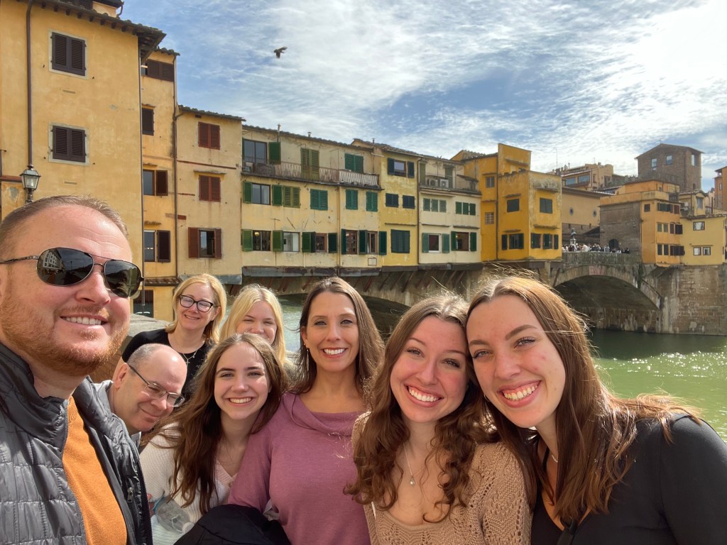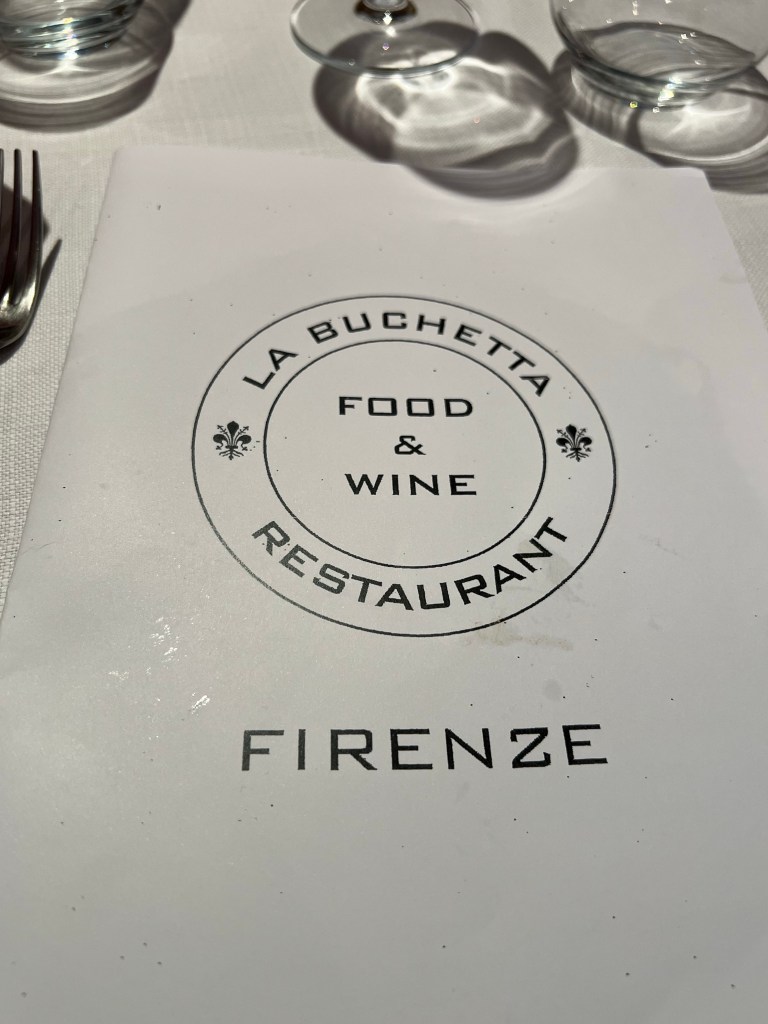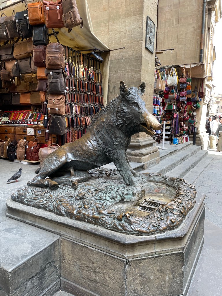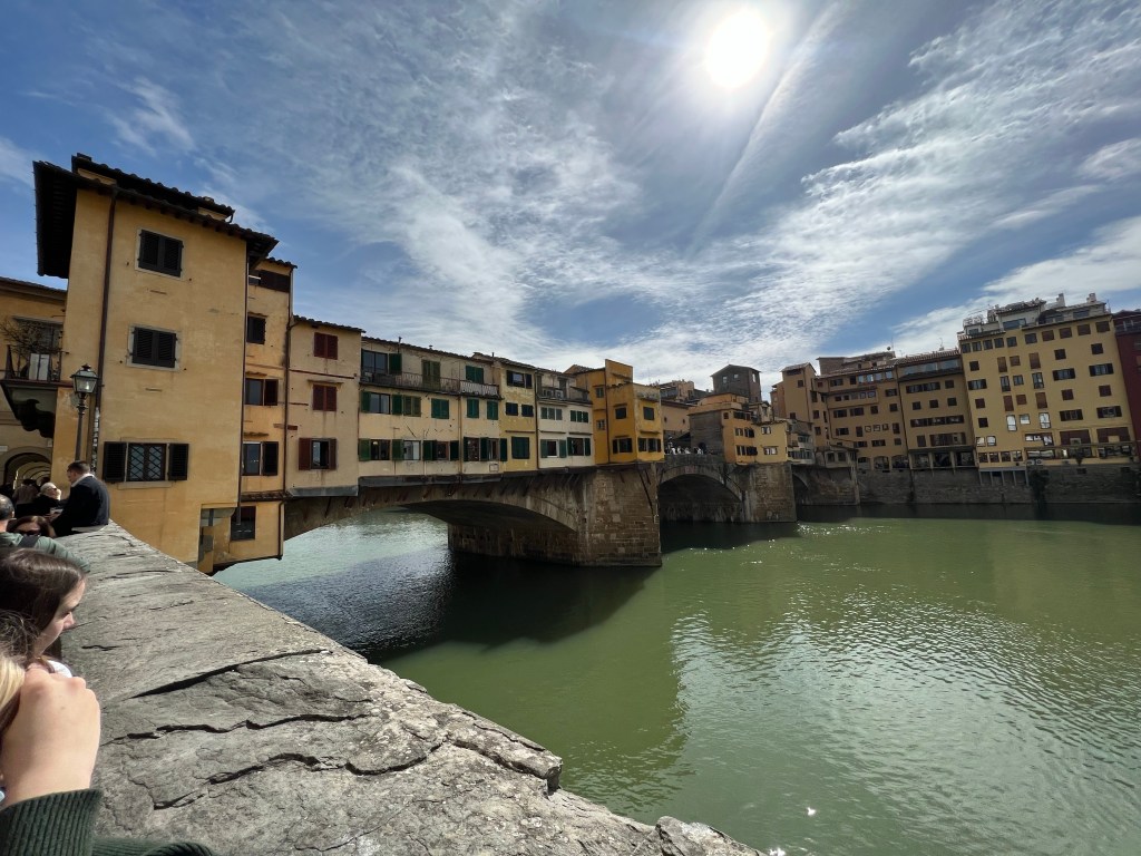 After leaving behind our bad news boar, we walked toward the Arno River and the Ponte Vecchio. Rather than cross the bridge right away we took a few pictures and headed to a restaurant for lunch. If you’re sending a pattern about food running the show, you wouldn’t be wrong.