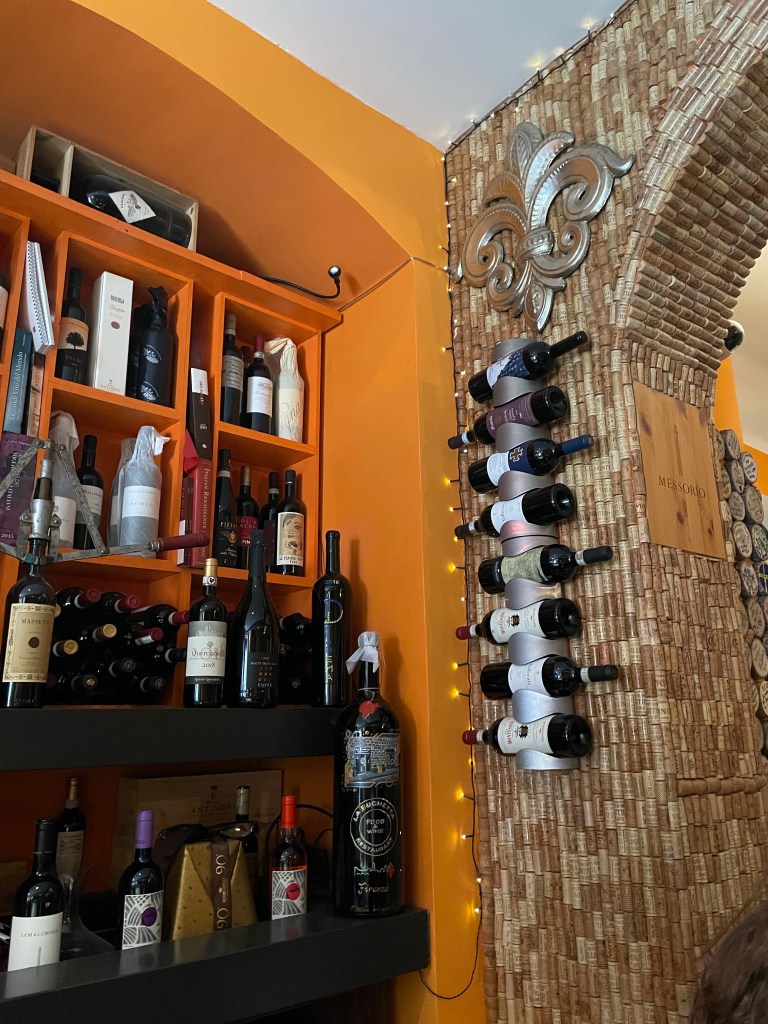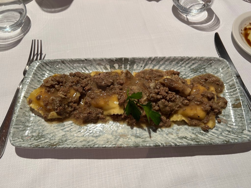 We stopped at a small restaurant La Buchetta that we’d heard about from a friend. It was little place slightly away from the touristy path. The menu was handwritten and in Italian. Some of the walls were decorated with wine corks and others had slices of trees logs that were signed by guests. It was a very cool spot. I enjoy a cheese ravioli with a meat ragu. But to me it looked like ravioli covered in meat. It was awesome.