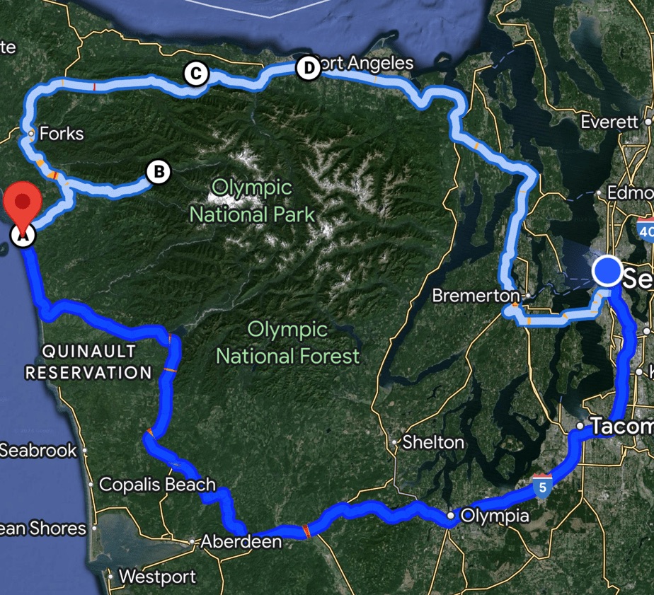 This was the rough idea. Leave Seattle and take the southern route along ONP and up to Ruby Beach. Then head to Hoh Rainforest, finally on to Marymore Falls, Devil’s Punchbowl, Port Angeles for dinner, and back to Seattle. For those of you familiar with the area, that likely sounds crazy. For good reason. It was projected at roughly 10 hours of just driving. That didn’t include stops or hikes. But, it’s who we are.