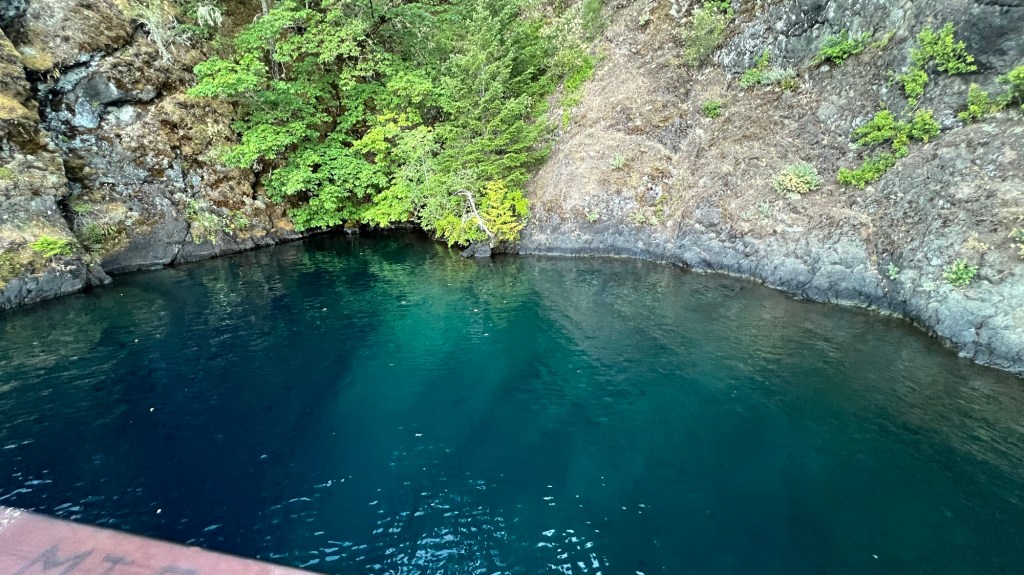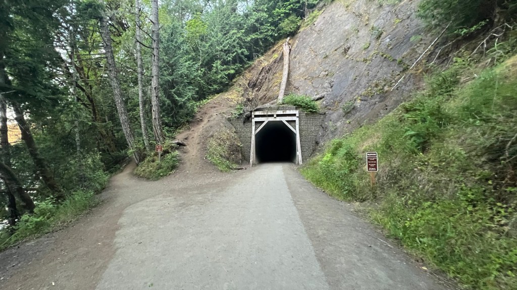 Four of us hit the trail and didn’t waste time. The “out” portion went quickly and was free from feline accompaniment. At the end of the trail was a small sign that pointed to Devils Punchbowl to the left of a particularly ominous old railroad tunnel. To be clear, if a cougar had showed up, I might have taken my chances doing battle versus a run into the tunnel.