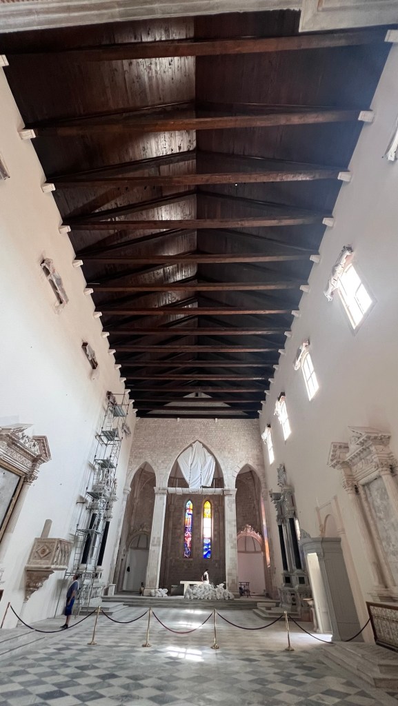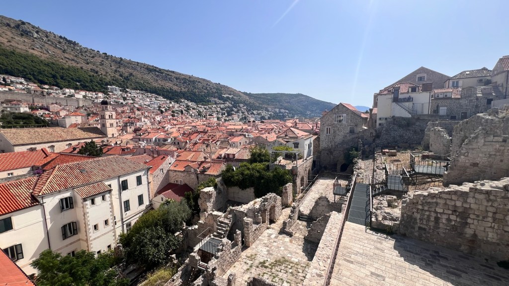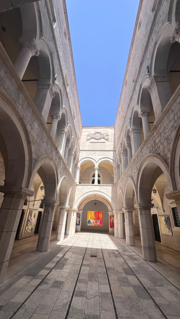 We left Rector’s Palace for the Sponza Palace. This is a unique building – still used today – which serves as both a rainwater catch for the city’s water supply and a repository for much of the city’s history. The inside was shockingly quiet and away from the crowd on the street, with very few visitors inside. We read a ton about the founding of the city, the earthquake, and its overall history in more detail than we’d seen elsewhere.