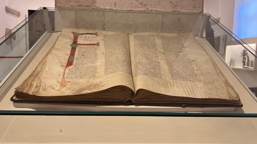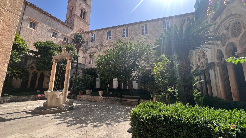 After our second palace of the day, it was time for a little religion. We headed to the Domenican Monastery. If Sponza wasn’t crowded, then this was basically abandoned. Very peaceful inside and shockingly cool, we walked through a beautiful building with a central garden which was very serene. The history of Catholicism is strong here and artifacts were plentiful. There was a very unique, and huge, Bible from 1448 on display. It seemed to have many fewer pages than the last Bible I read, which made me wonder what was missing from this version or had happened since then to be included in mine… The Monastery was great but it was almost 2pm and we were thinking some water and a snack were becoming important.